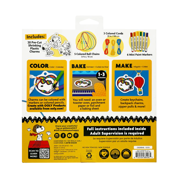 Make your own Snoopy charm-making kit! The OOLY x Peanuts DIY Shrink Art Kit lets you create 20 colorful Snoopy charms that shrink down to accessory size when baked. Complete with ball chains, colored cords, and mini paint markers, this craft kit is perfect for kids and Snoopy fans alike. Use these charms to personalize your backpack, keychain, or anything else kids love to decorate! Whether you’re showing off your loyalty to Snoopy or creating charms inspired by your favorite Snoopy moments, this DIY shrink art kit adds creativity and fun to every project.