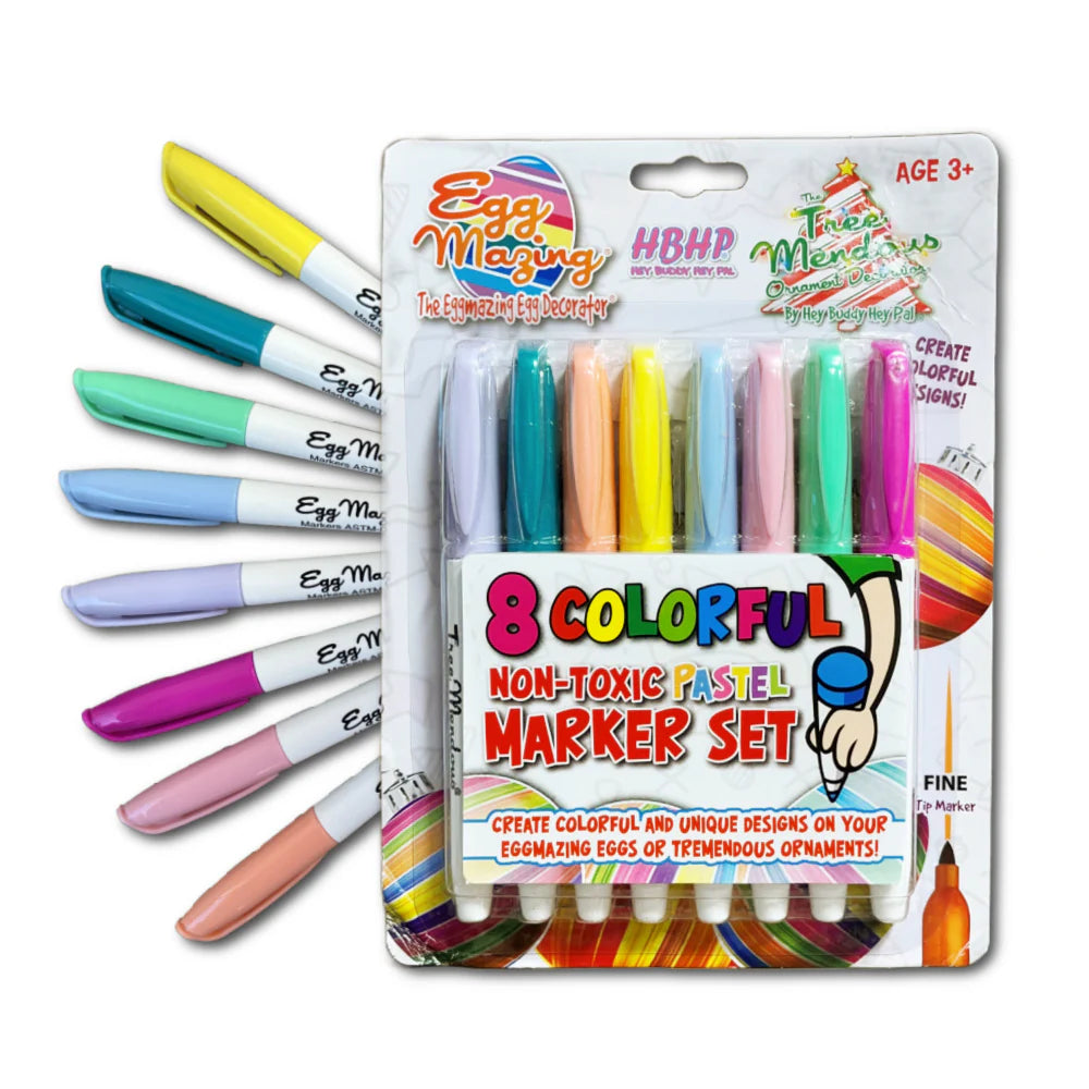 NEW PASTEL COLORS! The Eggmazing & Treemendous marker set comes with 8 quick drying, non-toxic, colorful PASTEL markers. The marker set can be used with any of the Hey Buddy Hey Pal decorators, including The Original Eggmazing, The Treemendous, The DinoMazing, and The Gift Box Ornament Decorator.