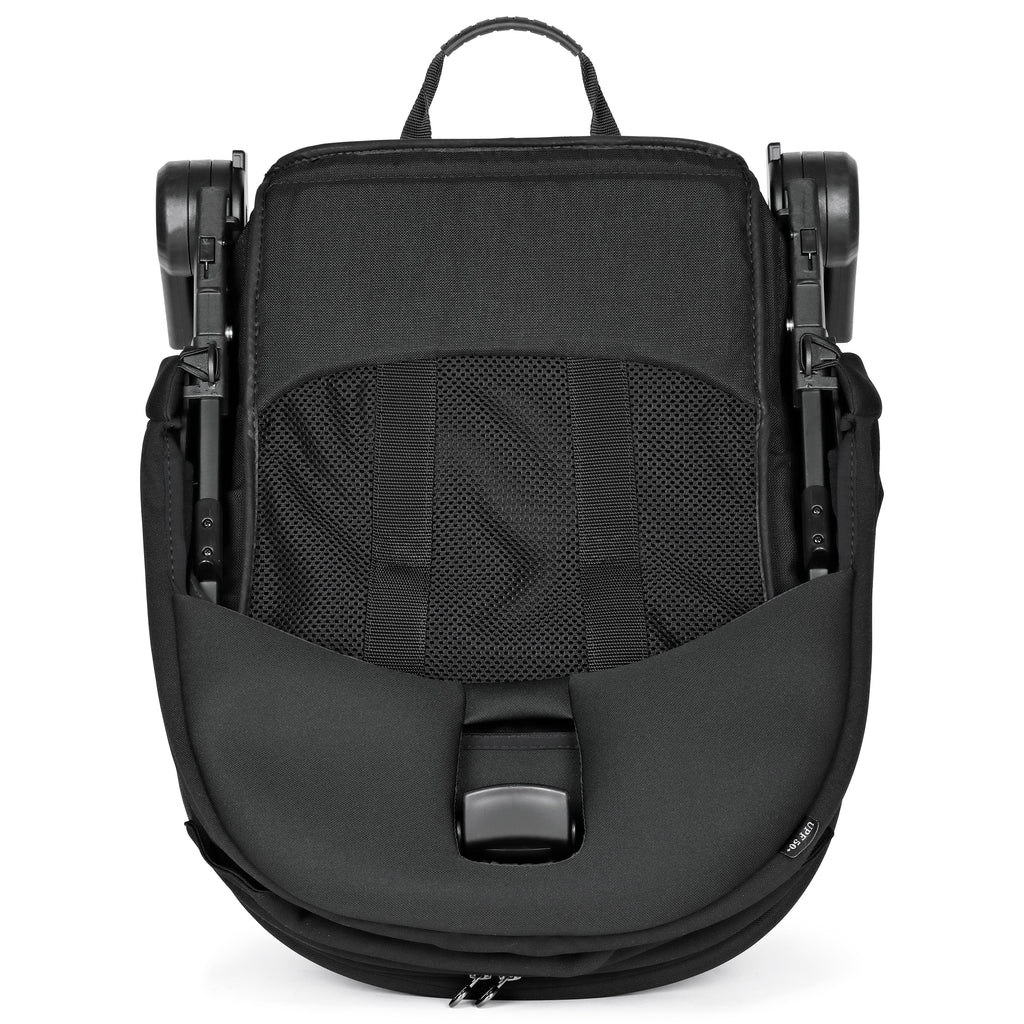 The stroller closes with one hand while the seat is attached. Once closed, the chassis stands upright.