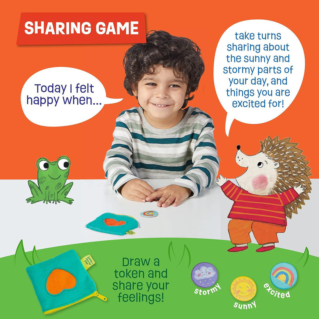 Engage your children with important family conversations about feelings and challenge their brains with memory-stretching fun! Follow along with Max the hedgehog’s sunny and stormy day with a beautifully illustrated picture book. Then use your memory skills to find the “sunny” and “stormy” matches from the story, and share about the highs and lows of your own day with the sun, cloud and rainbow sharing tiles. The picture book, matching game and colorful sharing tiles make for a wonderful way to start feeling-sharing time as a family, no matter the weather.