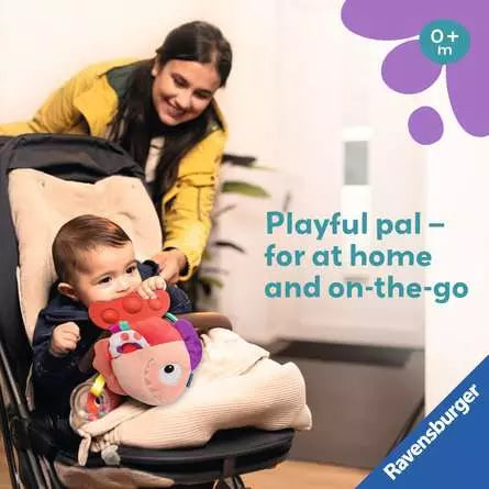 This cute piranha with snuggly plush body is the perfect fishy friend to keep baby entertained. The soft silicone tail is ideal for soothing sore gums and the pop-it features will keep those little hands busy. The rattle ring is easy for baby to grasp and shake, and the bright, contrasting colours offer engaging visual stimulation. Pop-it Piranha is a loveable friend for anytime play, and the handy clip makes it easy to take the fun along wherever you go!