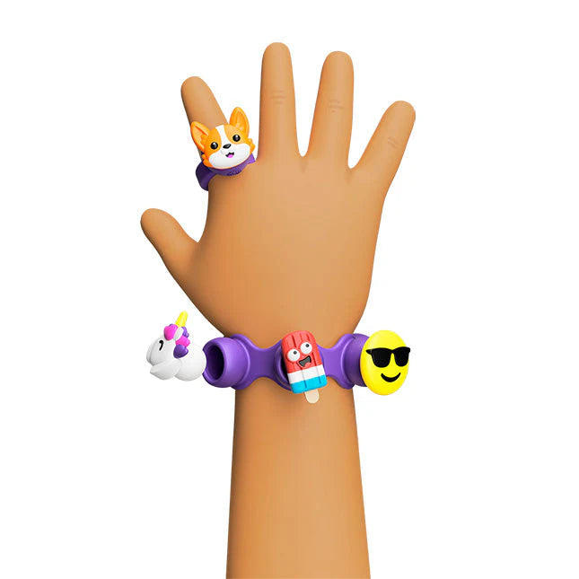 Pick your favorite charms and fit them into the sockets of the silicone bracelet and ring. It's a playful way to accessorize - on your wrists and fingers or even on a backpack - and when you pull them out, they make the most satisfying "POP!" Each set comes with a bracelet, a ring, and eight unique charms. Collect them all. Trade them with your friends. Let your personality POP with Plip Charms!