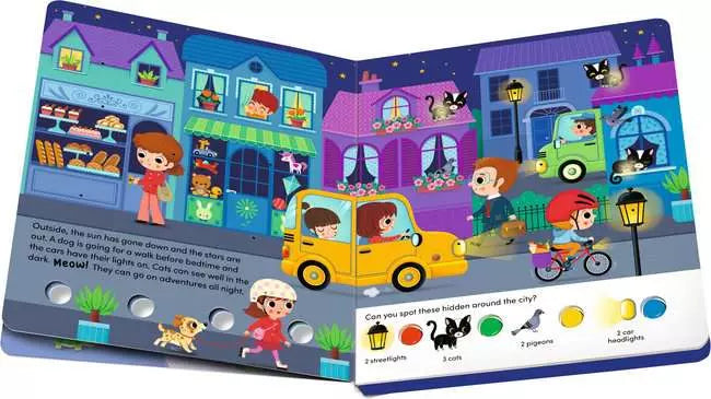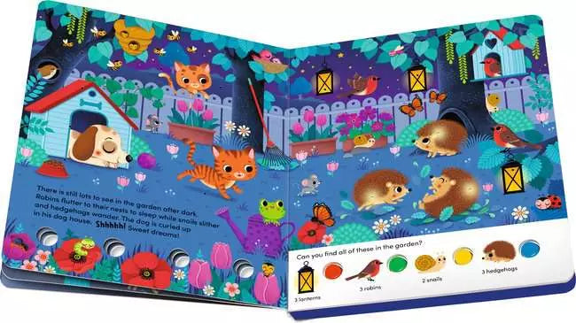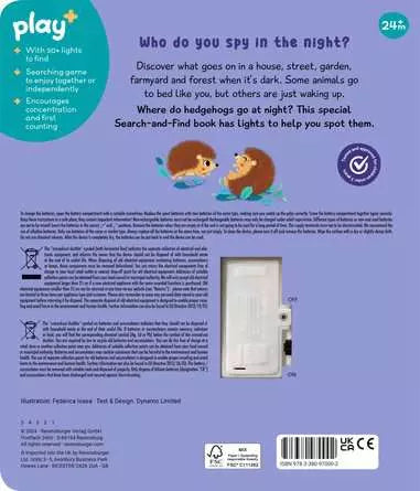 In the evening, the children go to bed and calm reigns in the house. But in the city, in the garden, in the forest and on the farm, there are also many things that happen at night. Can you find all the cats, hedgehogs and owls? The lights will help you! Just press the button and the lights reveal where animals and objects are hiding. A Seek and Find book with lights to learn to count and find colorful images!