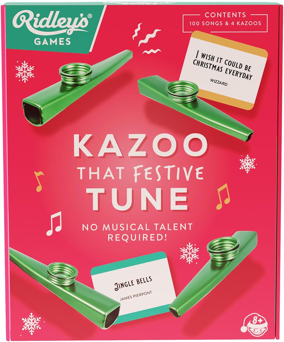 🎁 LET’S GET FESTIVE – It’s time to step into the holiday spirit, spin the dreidel, and rock around the tree with Kazoo That Festive Tune from Ridley’s Games! There are 100 well-known festive tunes to hum through four kazoos, so surround yourself with people who love to laugh and go all in to make memories that will last forever.