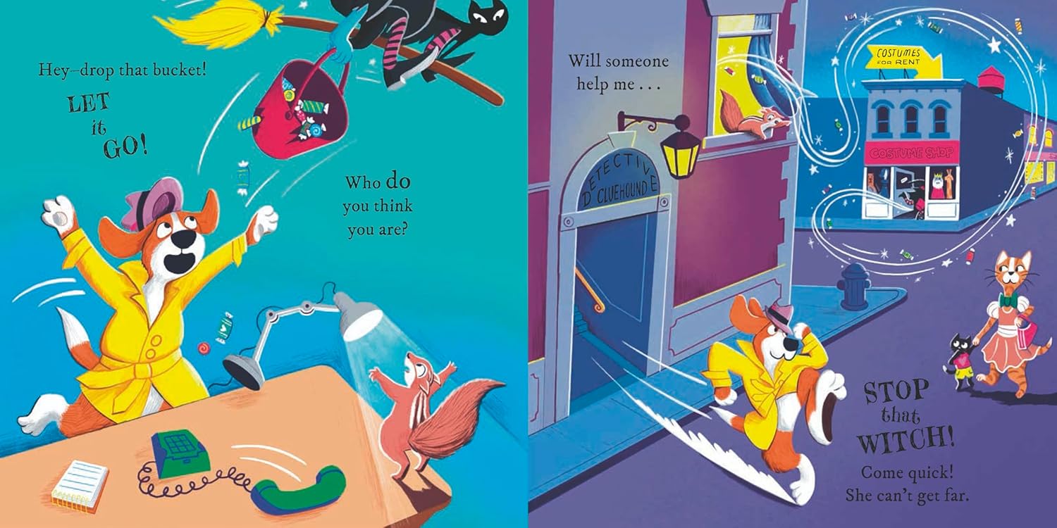 Thus begins a chase to apprehend the thief. Wherever they look, the witch is one step ahead until—POOF—she disappears. Is Halloween ruined for poor Detective Cluehound?