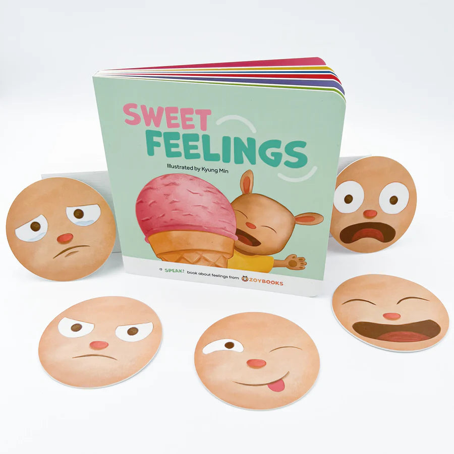 One ice cream cone. So many emotions! Explore the world of emotions with this engaging and interactive board book about feelings! Follow along the emotional rollercoaster our friend rides after accidentally dropping his ice cream cone. Each spread features a detachable feelings mask that reveals a mirror underneath, allowing children to mimic and better understand each emotion. This early learning toy is a fantastic way to teach children about beginning social-emotional concepts and communicating how they feel!