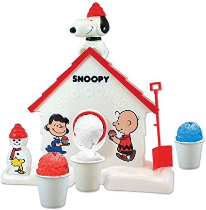 PEANUTS CHARM IN EVERY DETAIL Includes 1 Sno Cone Machine featuring Snoopy atop his iconic red doghouse, 1 Flavor Packet, 1 Scoop, 1 Blender Cup, 1 Cone Cup, and 1 Mixer Cup.