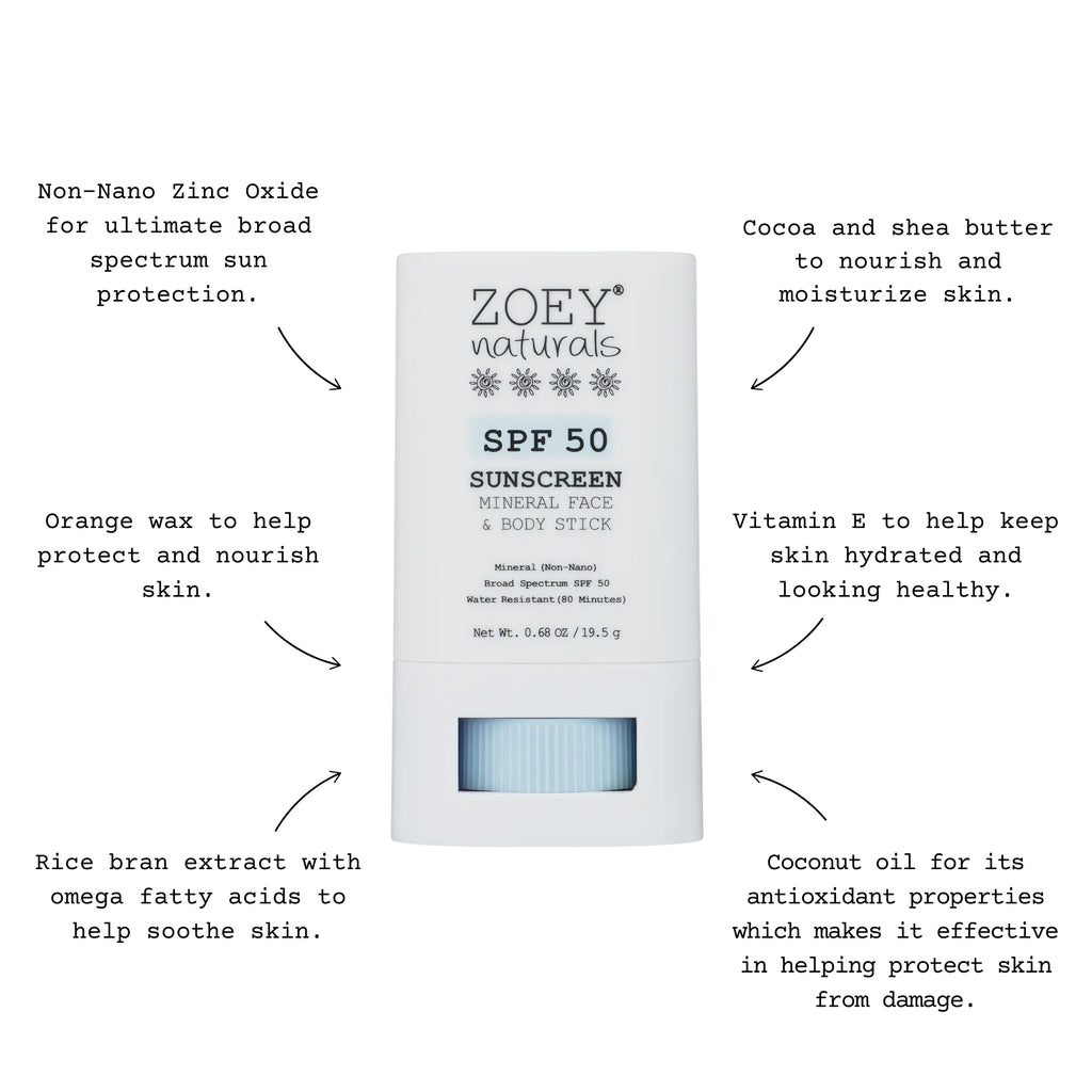 Our SPF 50 mineral sunscreen face and body stick is an advanced non-nano zinc formula that provides reliable and comprehensive broad-spectrum protection against both UVA and UVB rays. It has a true 80-minute water resistance to offer extended protection during water activities and outdoor adventures, and the fragrance-free formula reduces the risk of skin irritation, making it suitable for even the most sensitive skin types. Our natural sunscreen face and body stick deliver a sheer finish for a lightweight and comfortable experience and is hypoallergenic, vegan, paraben-free, and phthalate-free. Additionally, it is reef-safe and free from harmful ingredients that can damage coral reefs and marine ecosystems.
